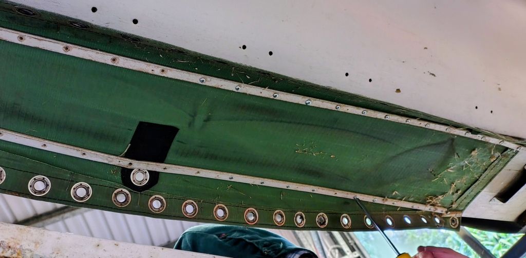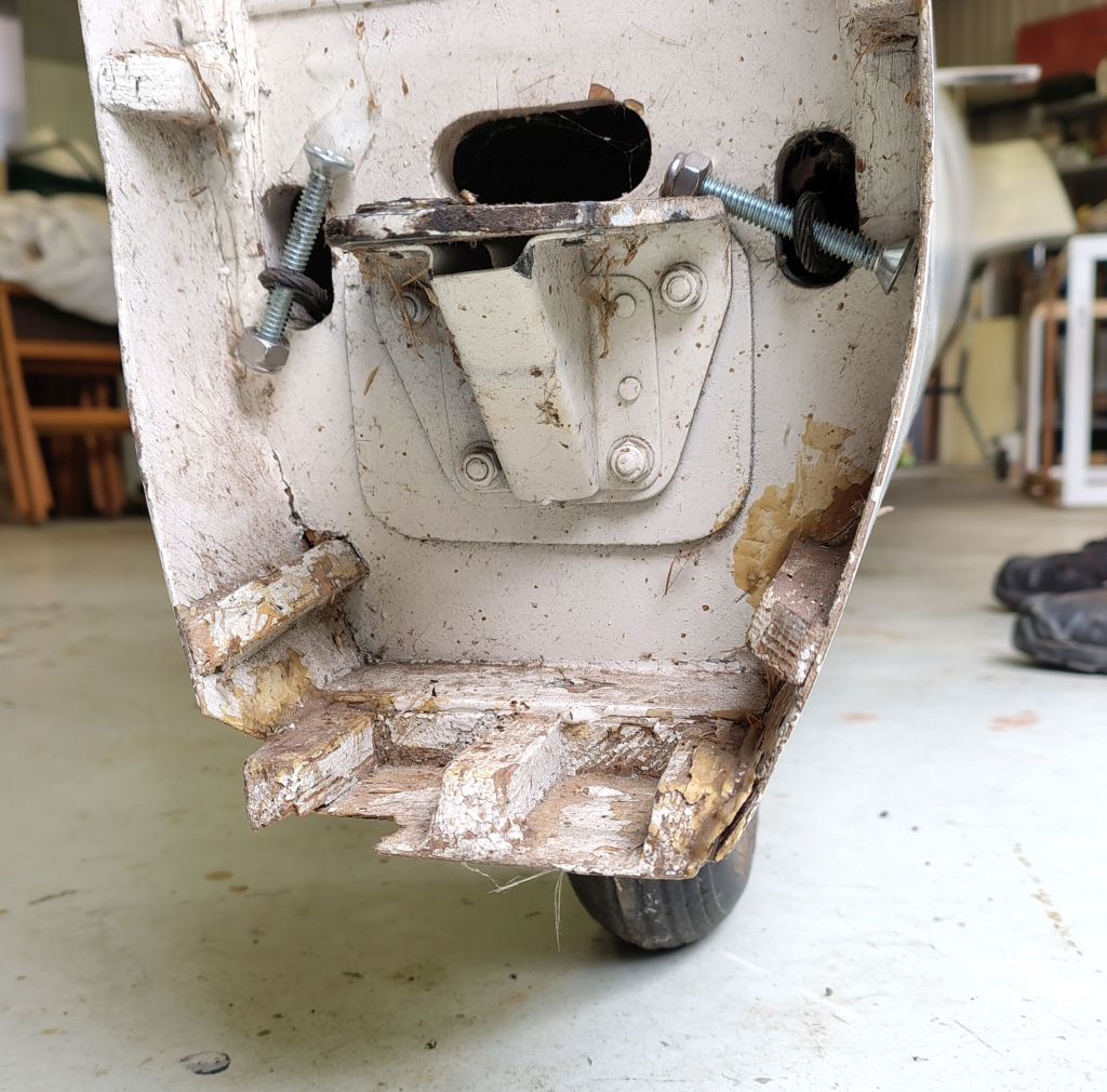 Removed skid and nose release access plate, also canvas shrouds and inner tube damper. Screws are not uniform, some are small, some large (very likely due to oversized wood screw holes). RECTIFY WITH NEW SAME SIZE SCREWS, PERHAPS EPOXY FILLING REQUIRED.