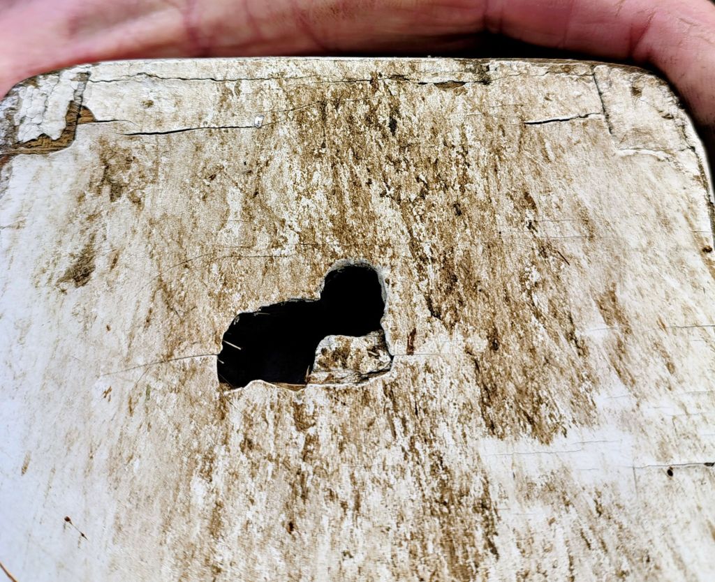 Glue separation at bottom of fin. MINOR WOOD REPAIR.