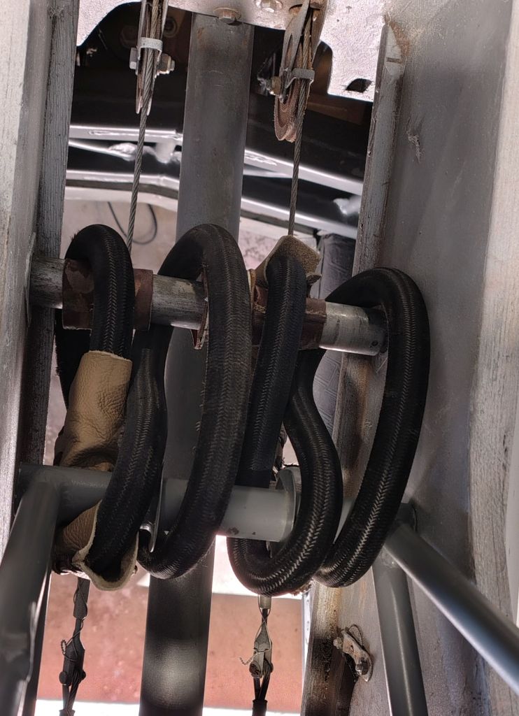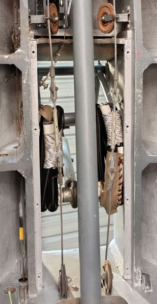 Neil was replacing the undercarriage bungees. This involved a couple of trial and error attempts to get the bungees to sit in the correct position, i.e. so that the leather sleeves are positioned so that chafing of the bungee splice is prevented or at least minimised.