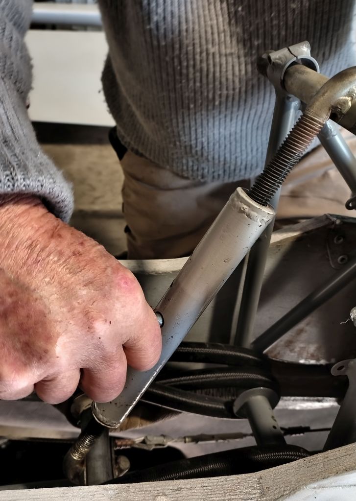 Neil using the Bungee Tensioner which is essential for the installation of the bungees. We are offered the use of this important tool when we come to working on the undercarriage.