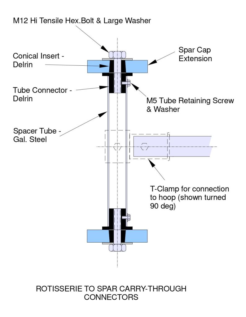 I made the components of the connectors today. They fit between the spar flanges without play. For the time being I’ve shown T-clamps to attach these connectors to the hoop, but Laurie might have a better idea.