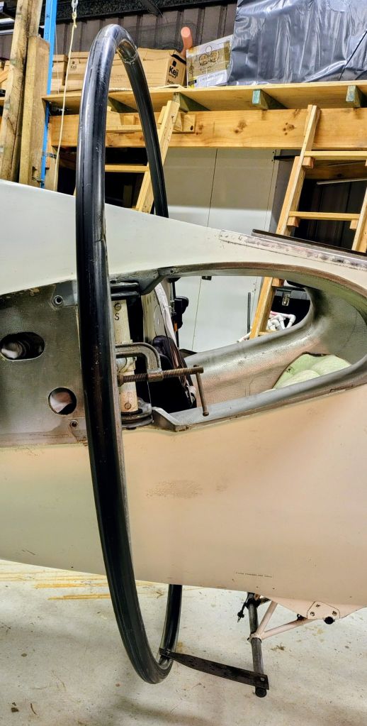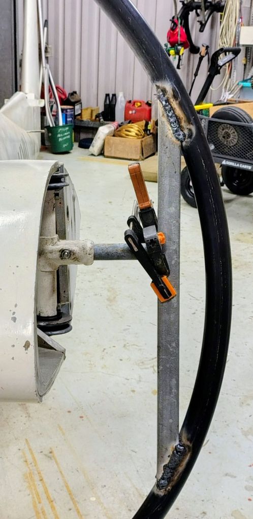 Today was “rotisserie meets fuselage day”. Laurie did a great job yet again welding the support struts onto the hoop.