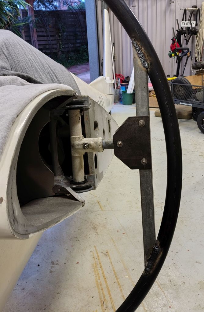Made 2 pairs of gussets out of 4 mm steel plate. They are bolted to the rotisserie frame and fuselage attachment stubs, to enable easy removal of the rotisserie hoop from the fuselage.
