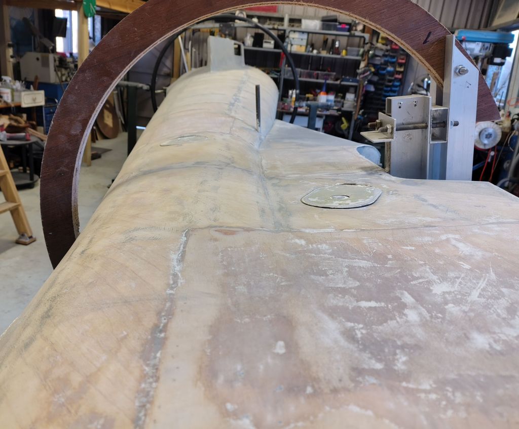 There is a dark grey epoxy filler applied at the bulkhead/stringer/skin joints. I’m not sure whether that’s original or part of Mike Burns’ effort. In any case, it can’t be totally removed without going into the plywood.