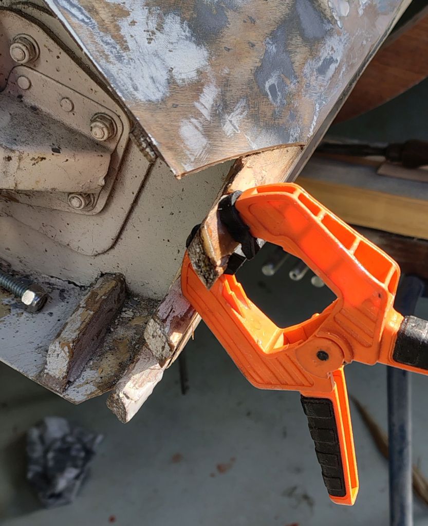We also spent some time doing a few repair jobs, chiefly at the bottom of fin and rudder. We are using West system 206/105 epoxy for all glue jobs, with microballon filler as required.