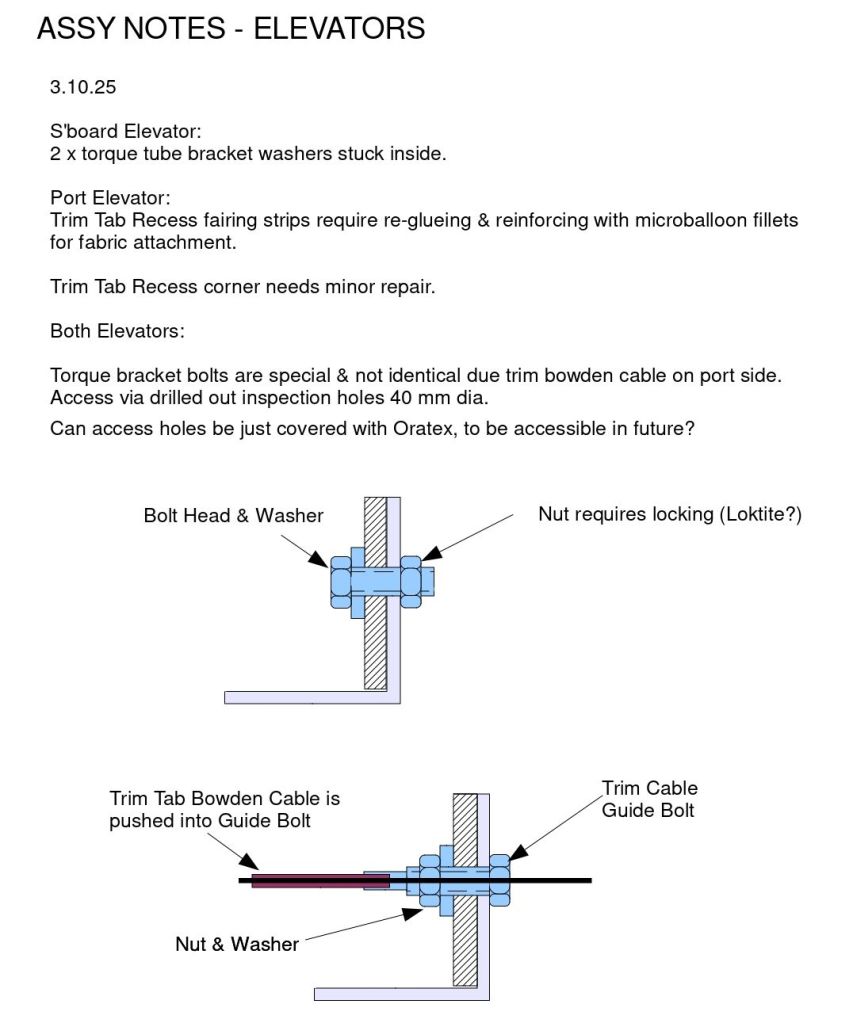 We needed to inspect the elevator torque tube bracket as one of the nuts was found to be loose. After cutting a couple of 40mm holes to gain access into the back of the bracket bolts we found the arrangement as described below.