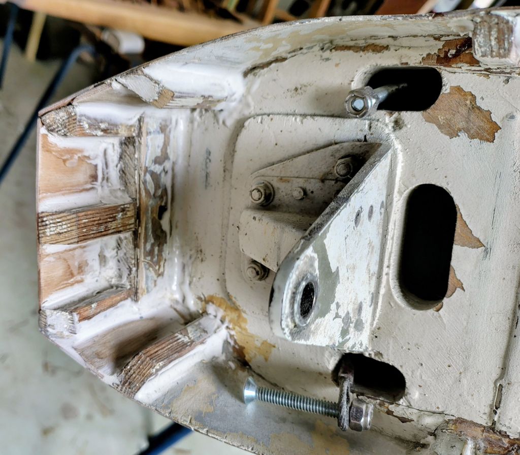 A real suprise awaited us after removing the fabric from the trim tab: a number of gussets and corner reinforcements had come adrift.