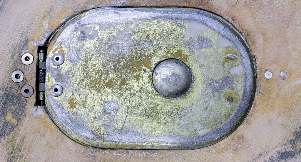 Fixing a broken hinge on the fin bottom inspection hatch.