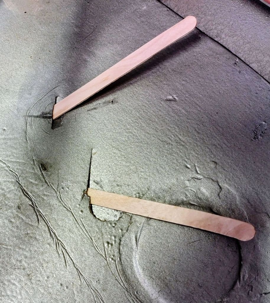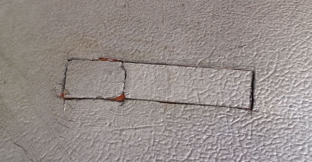 By now I’ve got that system down pat and it didn’t take long to cut out the cracked area, make up a plywood backing piece and epoxy/flock it in.