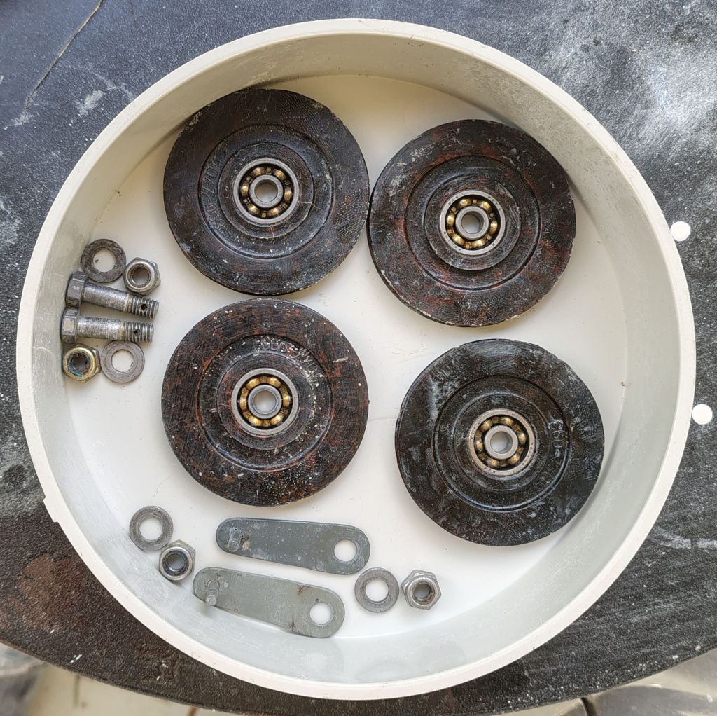Then took out the rudder cable pulleys from the rear cockpit. As expected, they washed out with WD40 and run like new. It is confirmed that they are factory originals from 1977, they have Poland 626 stamped on the bearings. 626 is a standard DIN bearing 19mm OD, 6mm bore and 6mm wide, easy to source if ever required. The pulley grooves show some wear (what a surprise after 48 years!), which chiefly seems to originate from the cable being “trapped” in one spot, i.e. the cable left an imprint in the bottom of the groove, there not being any relative motion between cable and pulley for a long time. So I’ll make sure when re-installing that the cable is positioned opposite to where the wear marks are.
