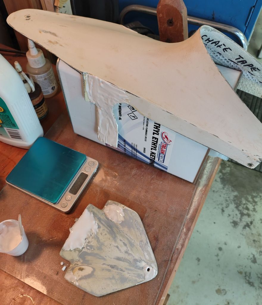 The fairings for the tailplane had cracks in them which were fixed by reinforcing with strips of glass epoxy, applying epoxy filler and sanding.