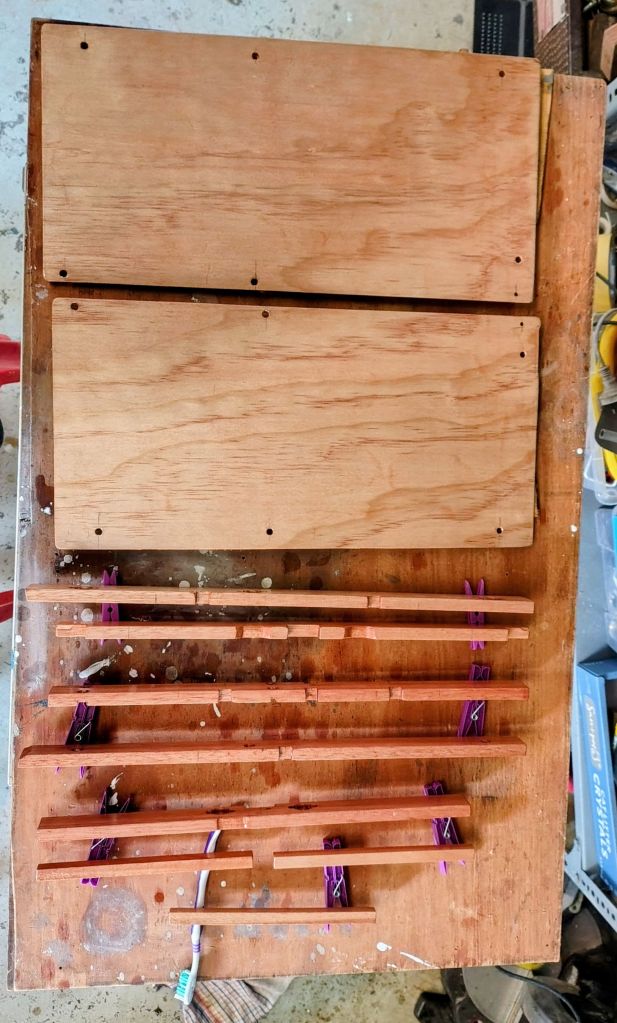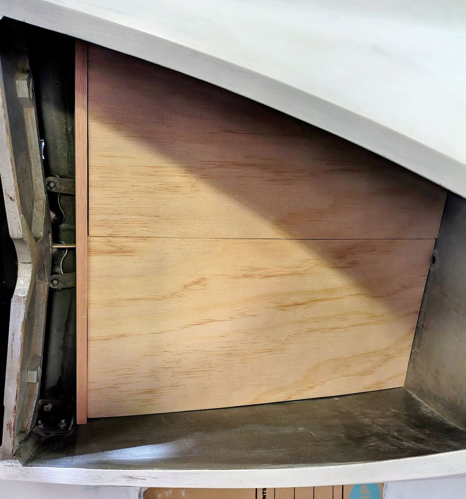 Work continued on the luggage shelf. The recessing of the frames for the nut plates turned out to be fairly time consuming. Laurie brought his router table down but it wasn’t used in the end. I found it easier to use a Forstner bit and a 6 mm router in the drill press to create the recesses.