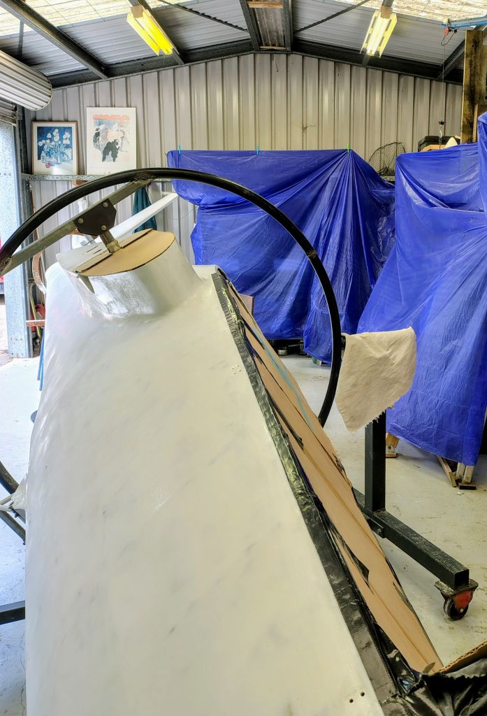 The fuselage needed a few more spots filled, otherwise it’s ready for the top coat. We have next Monday pencilled in. In preparation we started putting up the plastic drop sheets around the shed.