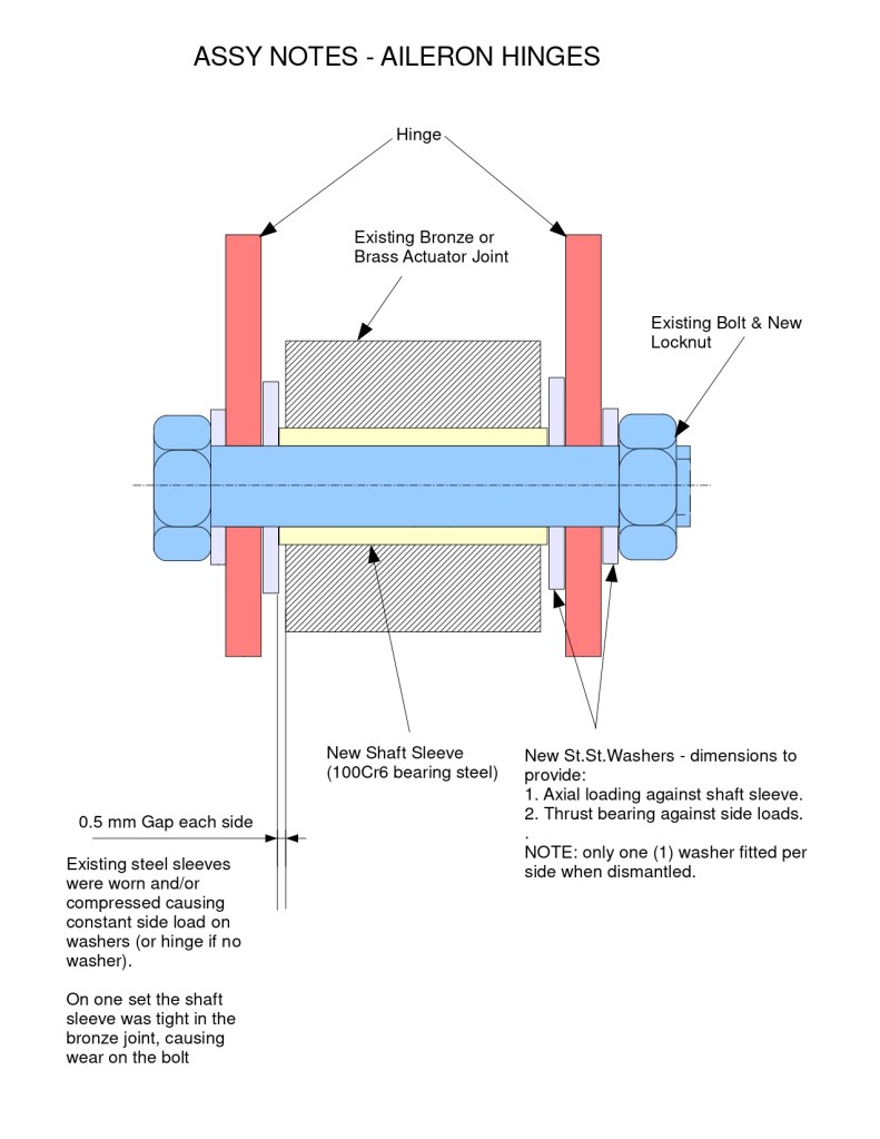 In a nutshell, what we assumed were worn bushes should actually be called shaft sleeves, the shafts being the hinge bolts. The above sketch illustrates the intended reforbishment plan. The issue of standard local high tensile bolt dimensions vs those of LN standard bolts is therefore redundant, as the bolt diameter is no longer that critical. We will replace all bolts with high tensile 8.8 or 12.9 Grade socket head cap screws with appropriate shank lengths and threads trimmed to suit. We will also investigate using all-metal lock nuts in lieu of nylok nuts, since the latter seemed not very firm on the M4 hinge stubs.
