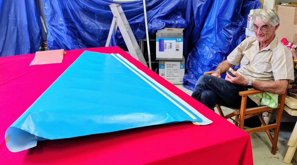 Initiatially all went well with lining up the rudder and tacking it to the fabric, as previously with both elevators.. Whether is was the heat, overconfidence on my part or just Murphy’s Law, I managed to arrive at a situation were I attempted to glue both overlaps on the trailing edge at the same time. Believe me, it doesn’t work! So after some grim-faced contemplation, we decided that the only way to fix this was to apply an 80 mm wide tape strip to the trailing edge, which is of course what the Oratex instruction stipulates.anyhow.