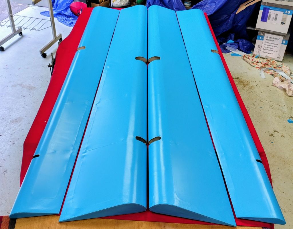 Today we finished covering the ailerons with sky blue Oratex. It’s fair to say that this job was quite nerve-racking due to the constant attention required for all the various individual operations and their sequencing. A moments inattention can have potentially disastrous consequences. Because of the high cost of the Oratex fabric, it is not economical to order extra length to cater for any eventual mishaps. Anyway, operating as a team worked really well, for instance Laurie often yelled “paper!” if it looked like I was going to use the iron without using the protective butcher paper underneath. We could have used longer work benches as the old doors are only 2.1m long while each of the four ailerons measures 2.4 m, but it was alright. The new small iron from Aircraft Spruce arrived just in time this morning before we started heat-stitching the Oratex to the aileron structure.